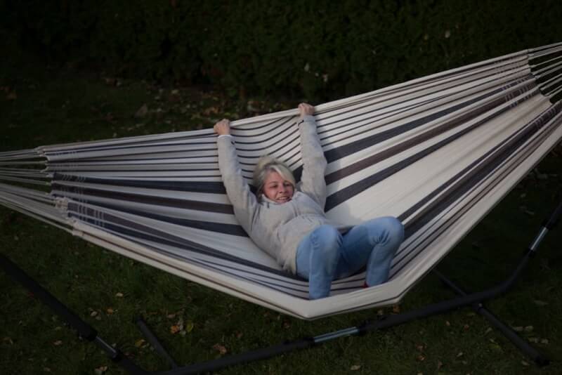 Befestigung: Als klassische Tuchhängematte ohne Spreizstab wird sie zwischen zwei festen Punkten montiert. Für leichtes Schaukeln kann sie U-förmig aufgehängt werden; für Liegen und Schlafen empfiehlt sich eine nur leicht bauchige Durchhängung. Benötigter Mindestabstand zwischen den Aufhängepunkten: ca. 360 cm.