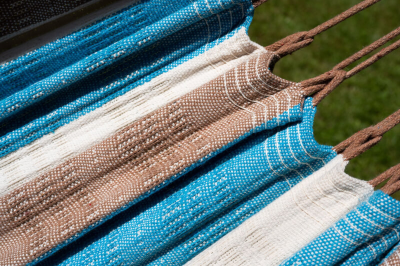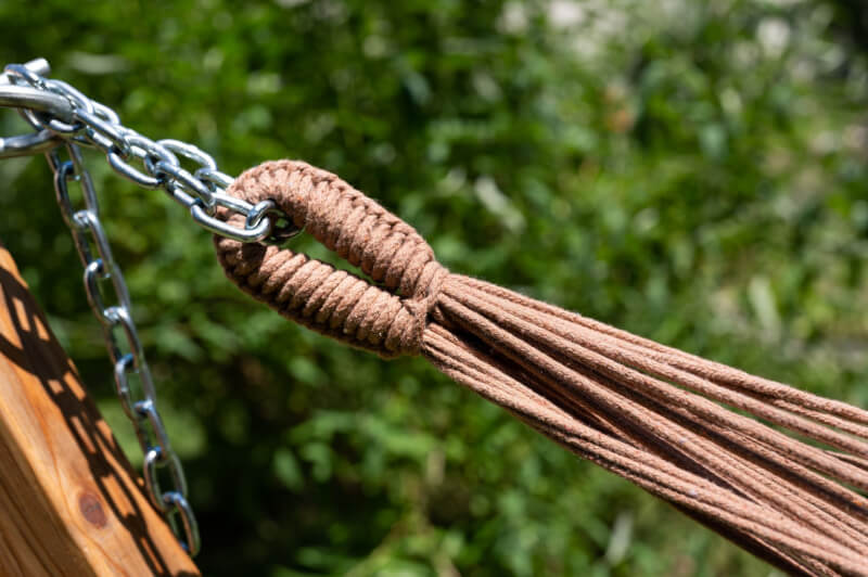 Befestigung: Als klassische Tuchhängematte ohne Spreizstab wird sie zwischen zwei festen Punkten montiert. Für leichtes Schaukeln kann sie U-förmig aufgehängt werden; für Liegen und Schlafen empfiehlt sich eine nur leicht bauchige Durchhängung. Benötigter Mindestabstand zwischen den Aufhängepunkten: ca. 360 cm.