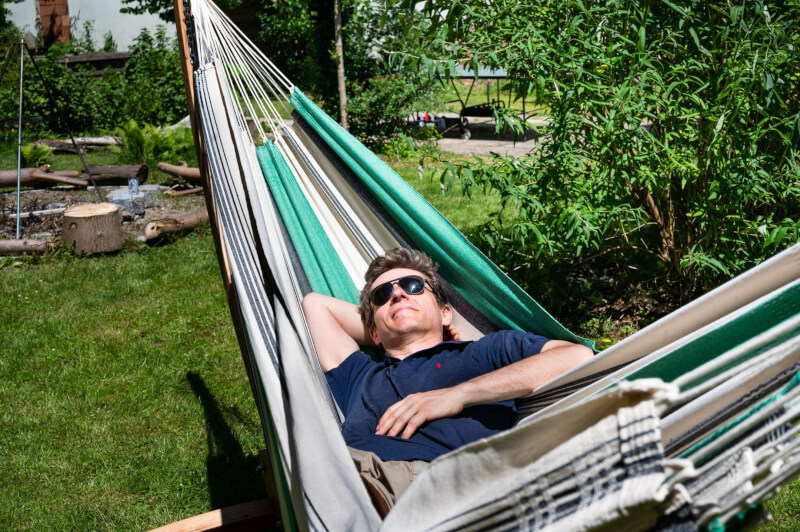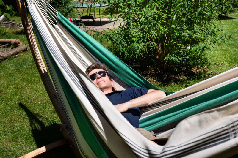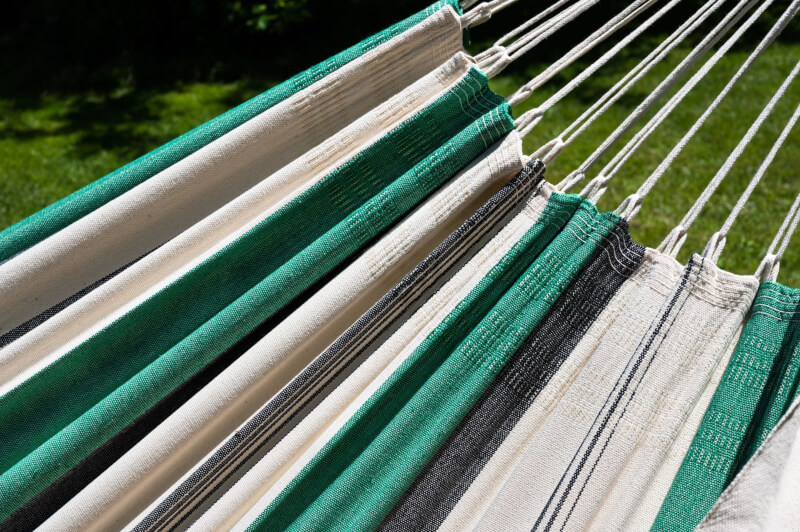 Befestigung: Als klassische Tuchhängematte ohne Spreizstab wird sie zwischen zwei festen Punkten montiert. Für leichtes Schaukeln kann sie U-förmig aufgehängt werden; für Liegen und Schlafen empfiehlt sich eine nur leicht bauchige Durchhängung. Benötigter Mindestabstand zwischen den Aufhängepunkten: ca. 360 cm.