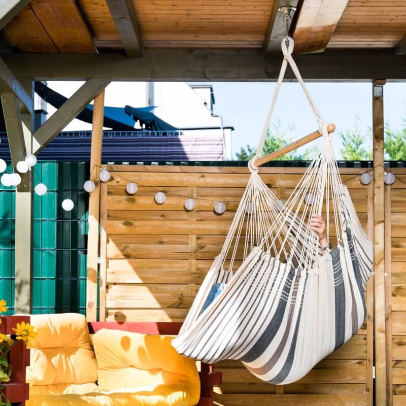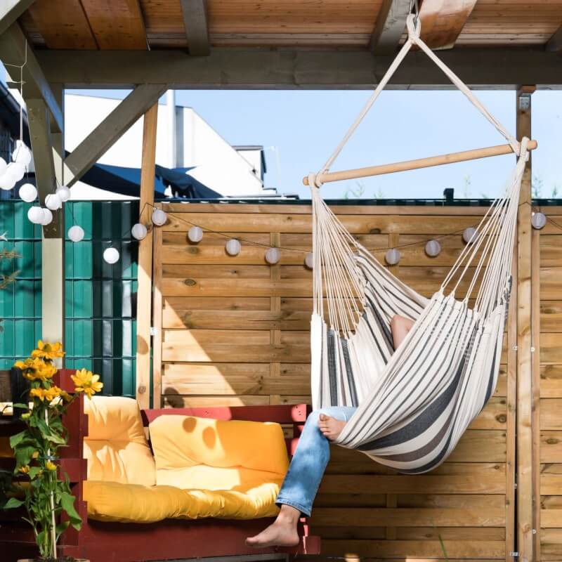 Intro: Der Relaxa Hängestuhl von MacaMex ist ein klassischer brasilianischer Tuchhängesessel aus 100 % Baumwolle. Dank kompaktem Format und kurzem Spreizstab eignet er sich ideal für Wohnung, Kinderzimmer oder geschützte Außenbereiche. Er bietet angenehmen Sitzkomfort für eine Person und sanftes Schaukeln zum Entspannen.