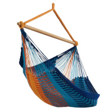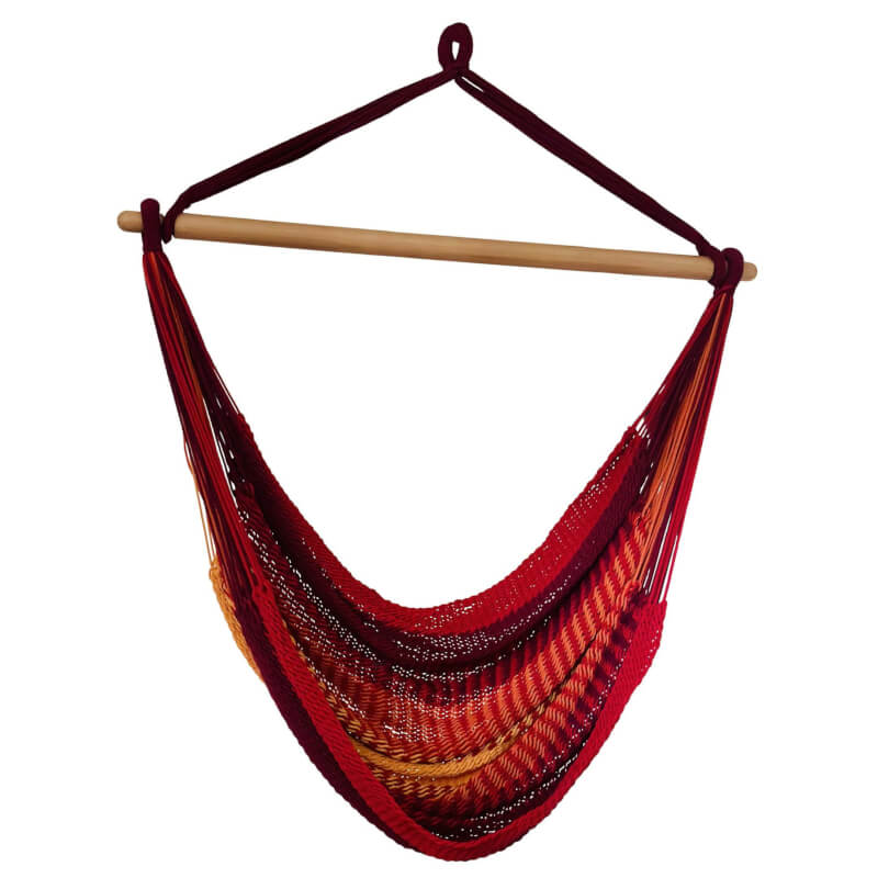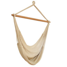 Besonders hervorzuheben: Extra dicke 3 mm Baumwollschnüre für Stabilität und Komfort; elastisches Netz bis 260 cm dehnbar für eine bequeme, aufrechte Sitzposition; 110 cm Spreizstab aus FSC-zertifizierter, geölter Buche; sichere Einkerbungen gegen Verrutschen; platzsparend aufrollbar; handgeknüpft in fairem Familienbetrieb.