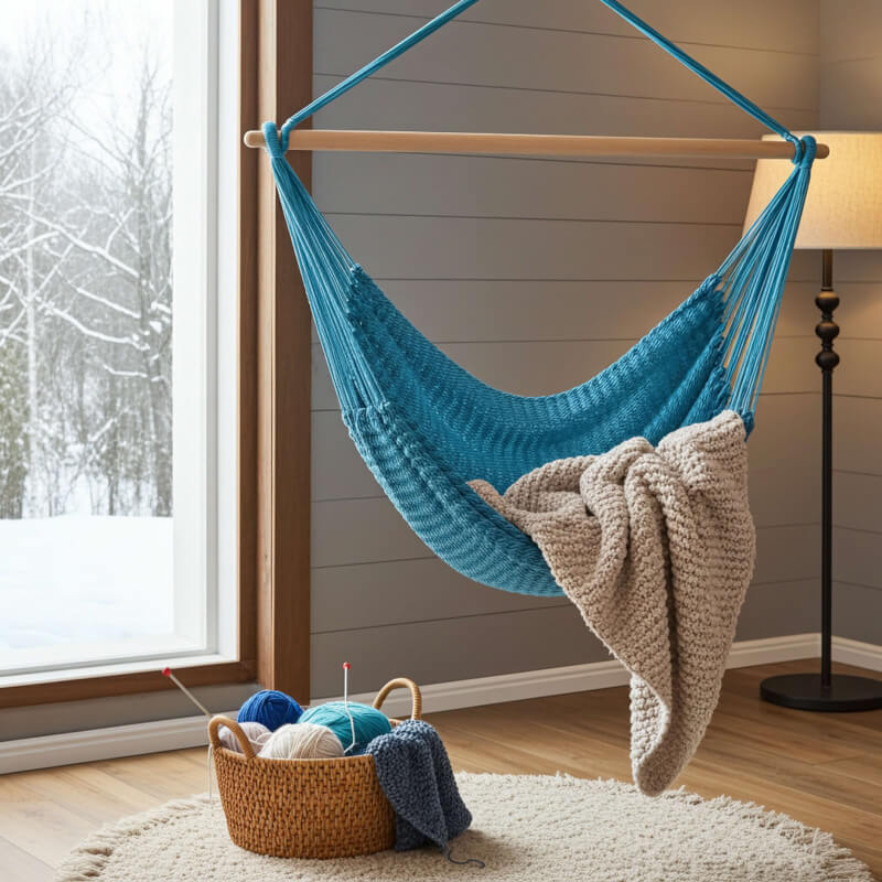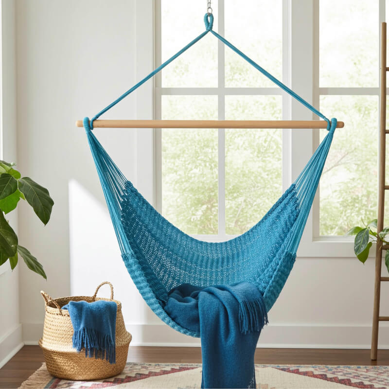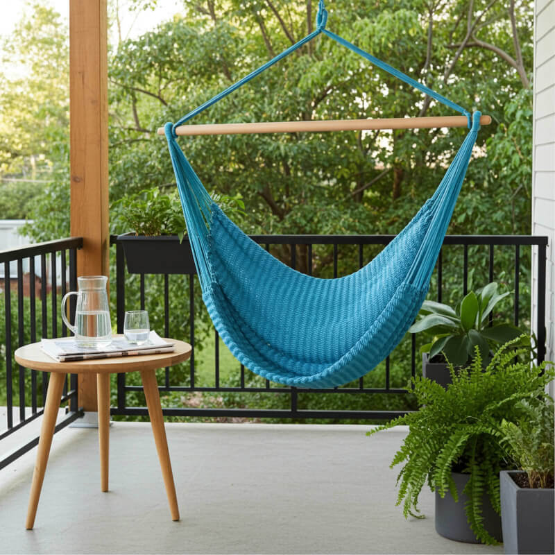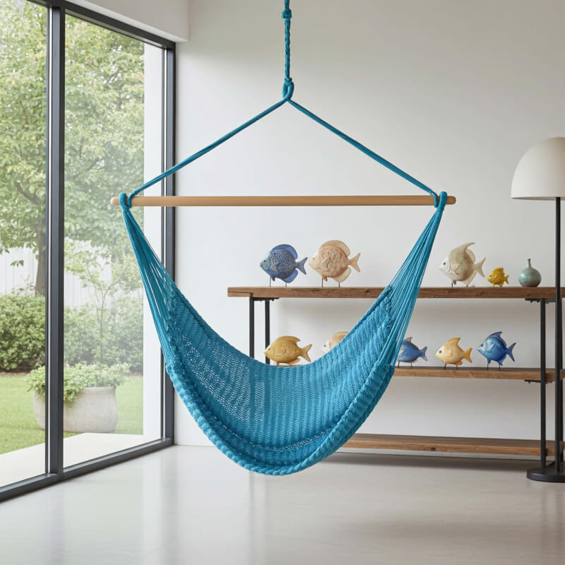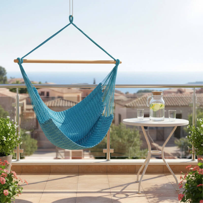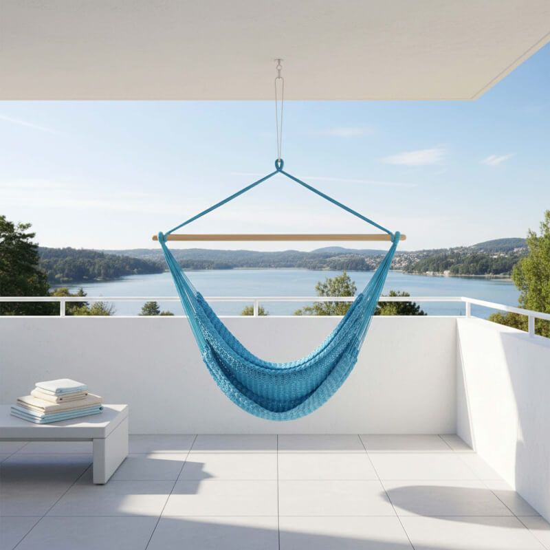 Intro: Der Netzhängesessel Vela Azure XL vereint Leichtigkeit, Komfort und robustes Naturmaterial in einem platzsparenden Design. Die weiche, elastische Netzfläche sorgt für entspanntes Sitzen – ideal zum Lesen, Träumen oder sanften Schaukeln. Dank Einpunkt-Aufhängung ist er flexibel für Innen- und Außenbereiche geeignet.
