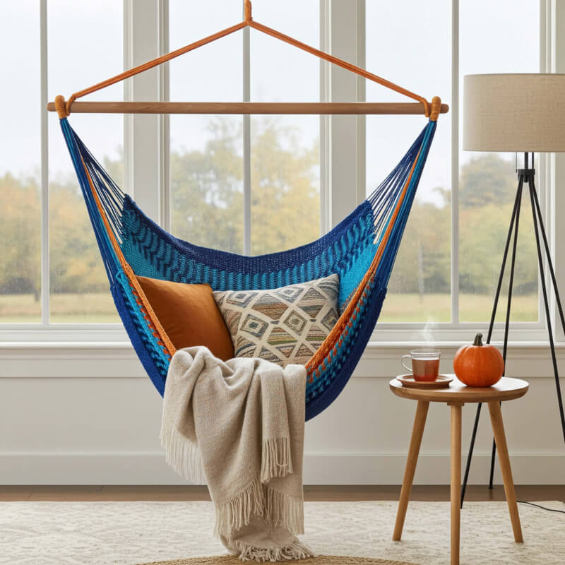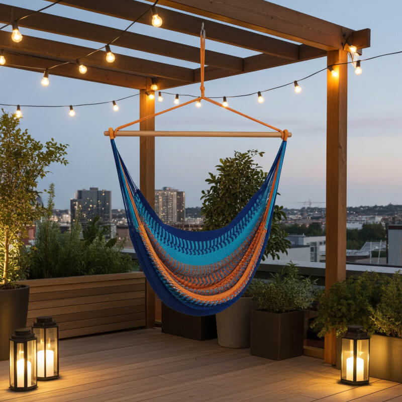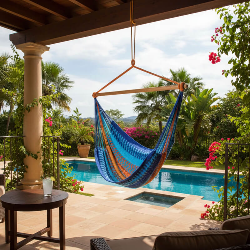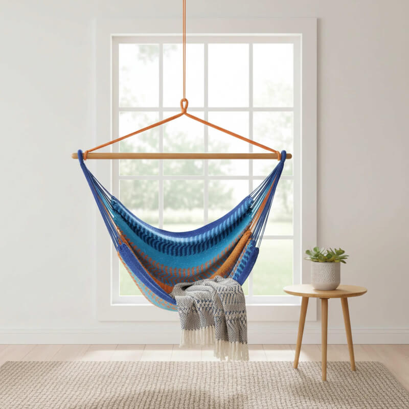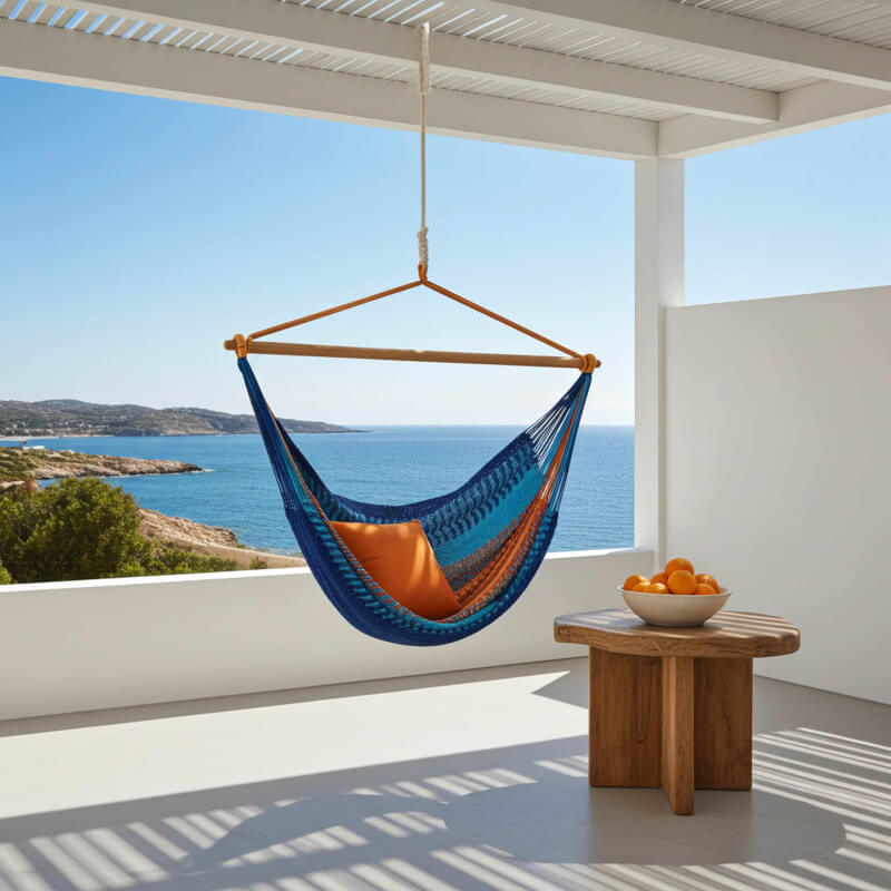 Intro: Der Netzhängesessel Vela Azure XL vereint Leichtigkeit, Komfort und robustes Naturmaterial in einem platzsparenden Design. Die weiche, elastische Netzfläche sorgt für entspanntes Sitzen – ideal zum Lesen, Träumen oder sanften Schaukeln. Dank Einpunkt-Aufhängung ist er flexibel für Innen- und Außenbereiche geeignet.