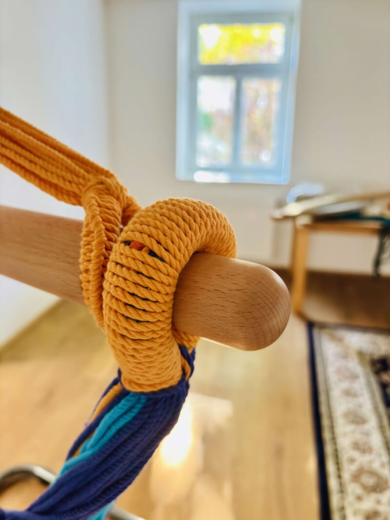 Befestigung: Befestigung über einen einzigen Aufhängepunkt, z. B. an Zimmerdecke, Balken, Pergola oder Baum. Die Einkerbungen im Spreizstab halten Aufhängeschlaufen und Seile sicher in Position und reduzieren Verrutschen. Bei Nichtgebrauch lässt sich der Hängesessel einfach um den Holzstab wickeln.