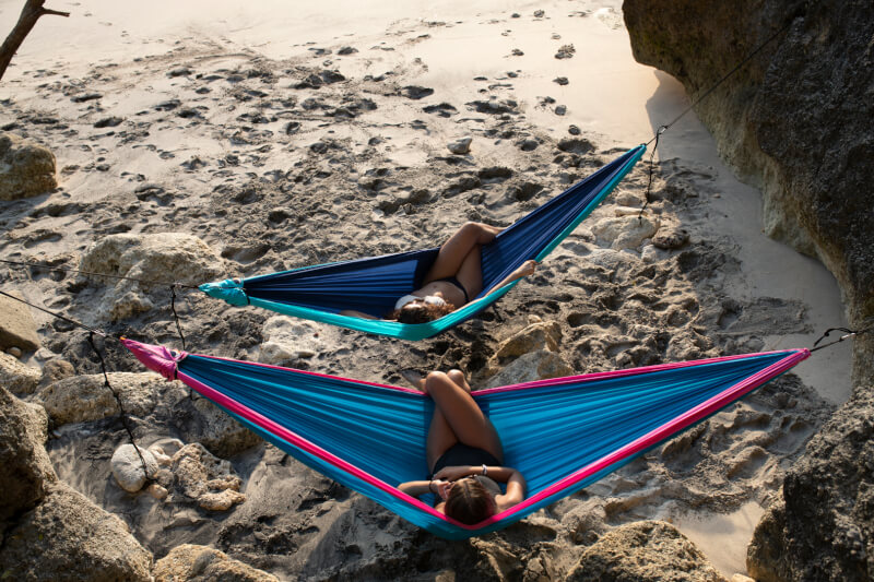 Besonders hervorzuheben: Kompakt und trotzdem unglaublich komfortabel; feinste Fallschirmseide; OEKO-TEX®-zertifizierte, handgemachte Qualität; intuitiver Aufbau ohne Knoten; praktische Seitentasche; inkl. Moonbag und S-Haken; faire Produktion.