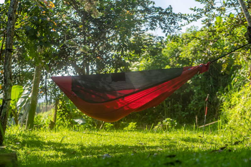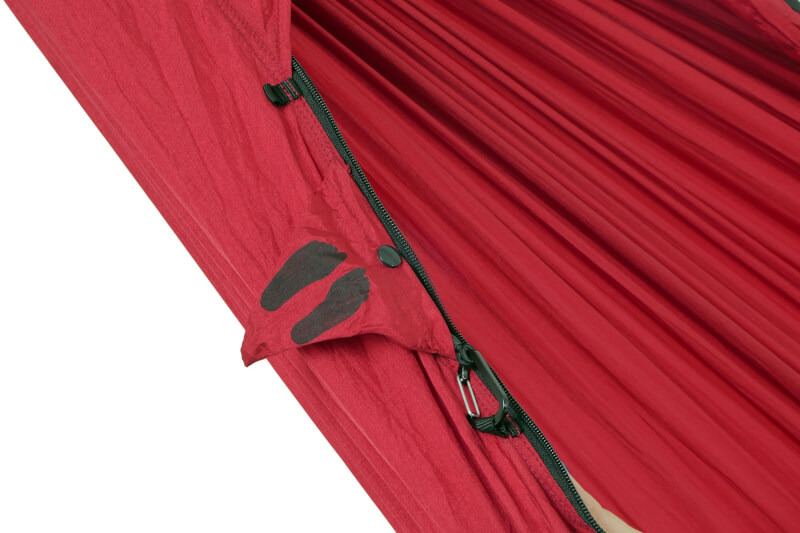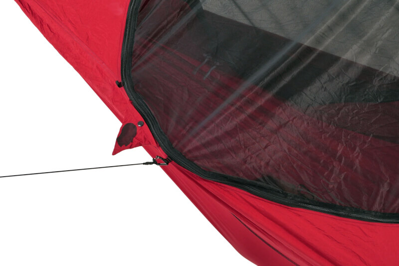 Befestigung: Inkl. 2 x 6kN Karabiner. Integrierte Ridgeline als flexibler Abstandshalter für ideale Liegeposition. Externe Schlaufen zum Fixieren von Underquilt oder zusätzlicher Ausrüstung. Zusätzliche Abspannpunkte mit elastischen Leinen (verstaubar in Dreieckstaschen).